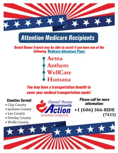 Daniel Boone Transit offers transportation for Medicaid recipients who lack reliable transportation to medical appointments. A 72-hour notice is required.
